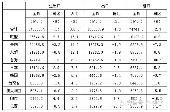 圖表 2 2016年前三季度中國前十大貿(mào)易伙伴進出口情況